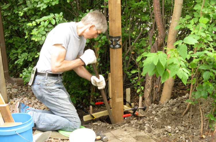 I started with the Easternmost post. I set up some wooden guides at ground level to make sure the positioning was correct for this one. The post level ensures* the post is put in vertically. Here I'm using the metal tamping bar to compress the fill that I've shoveled into the hole.