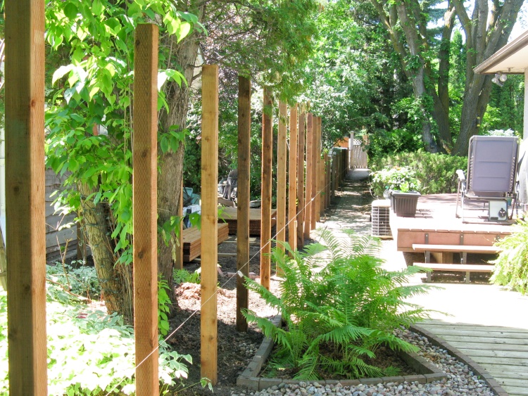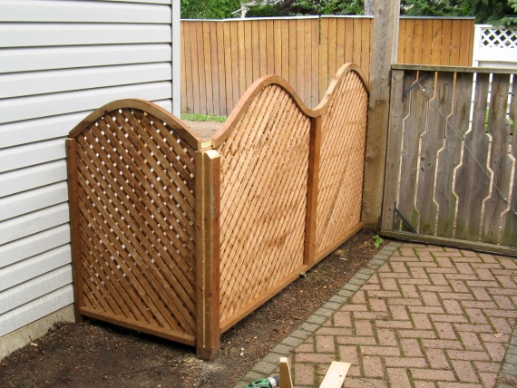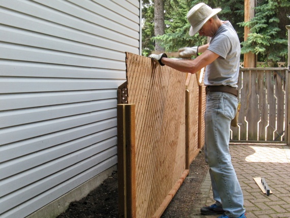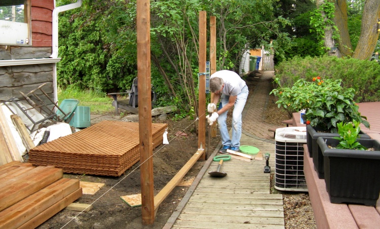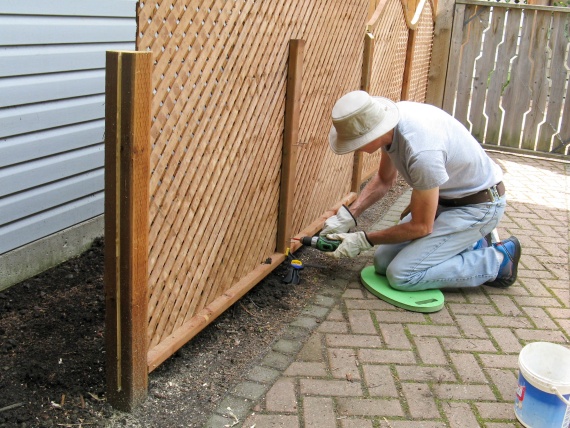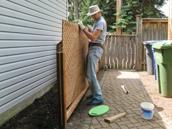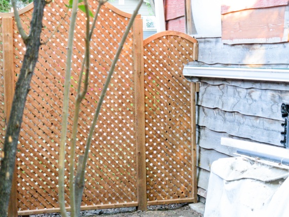This shot shows a number of short sections with the lattice pieces installed. The top of each section is the same height off the ground so the level differences in the latttice top edges are due to the slope of the yard.