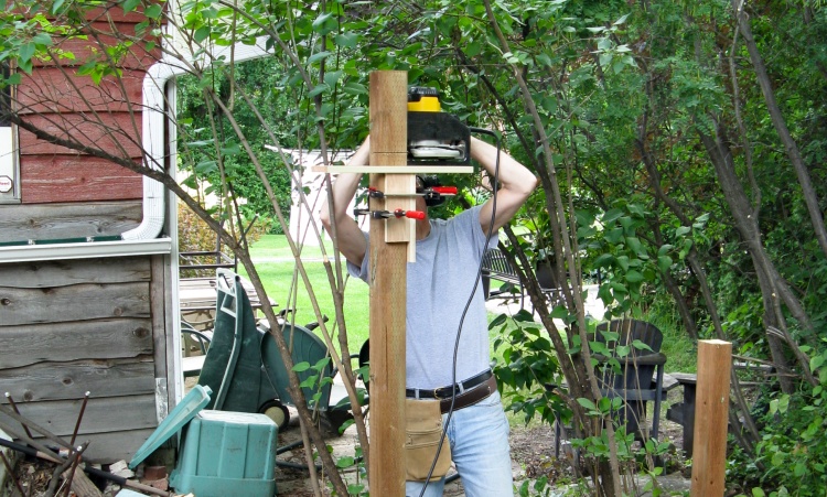 The plan to hold the lattice was to have slots in all edges. That included the posts and here I'm routing a vertical slot in a post using a hand-held router with an edge guide clamped to the post.