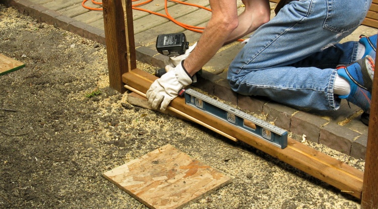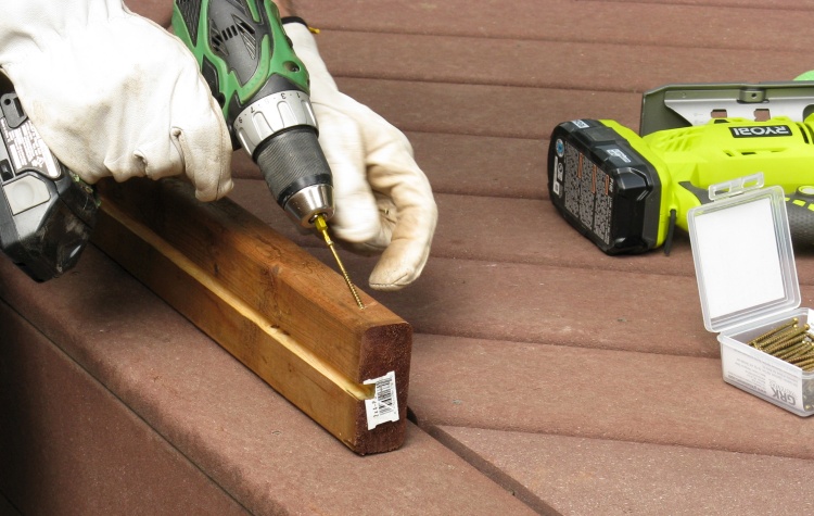 The bottom rails were screwed to the posts using angled screws. Here the rail has been cut to length and I'm starting the screws up on the deck where it's a bit easier to do.