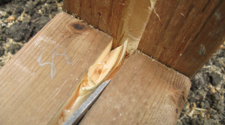 Unfortunately out of around 60 rail-to-post connections, maybe 3 of them lined up exactly. For the other 57, I needed to carve the rail slot a bit at the ends to make sure the lattice could fit in. A chisel made quick work of this in the soft wood of the rails.