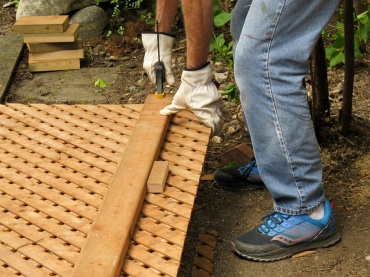 I inserted the lattice into the post notch on one side and then by flexing it in the center was able to get the other edge past the second post and to its notch. Then I whacked it downwards to drive it into the slot in the bottom rail, with the ocassional stop to push recalcitrant lattice slats into the slot.