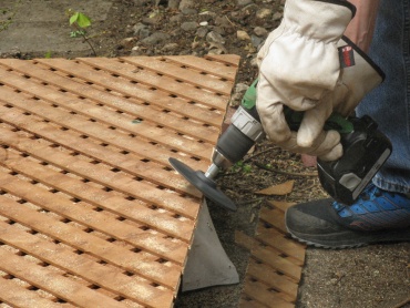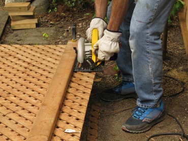 There are thick staples holding the lattice together at half of the crossing points so I usually need to saw through one or two staples when doing a curve. For this reason, I used a metal-cutting blade in the saw since it has no problem cutting wood, and goes through the staples as well without dulling.