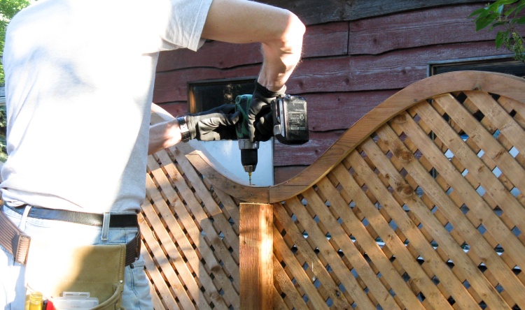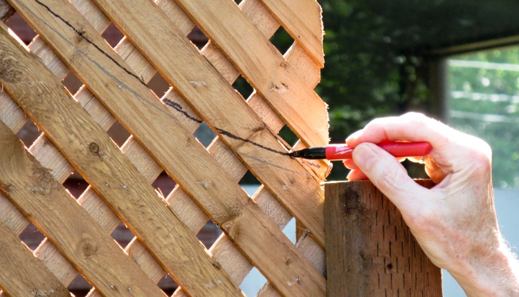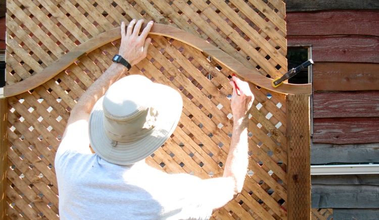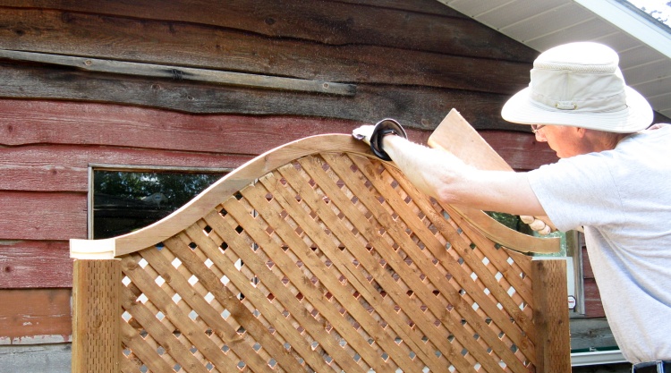 With the lattice in place the next step was to mark the shape of the curve which I am shown doing here using a pencil. The fence-top curve I am going to use is just clamped against the lattice for this operation.