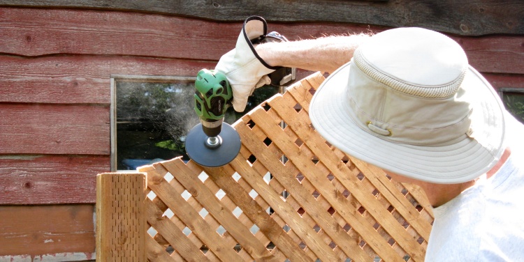 With the bottom rail on, the section was ready for the lattice. The lattice was trimmed to size using the circular saw based on my measurements of the width of the section at top and bottom. As shown below I clamped on a straight 2x4 as a cutting guide, which was spaced 1.5" from the cut line using my calibrated wood chunk (which corresponds to the baseplate-to-blade distance of the saw). After cutting I used a sanding disc to bevel the edges of the lattice a bit to make it easier to get into place.