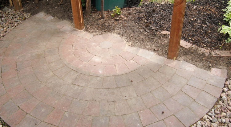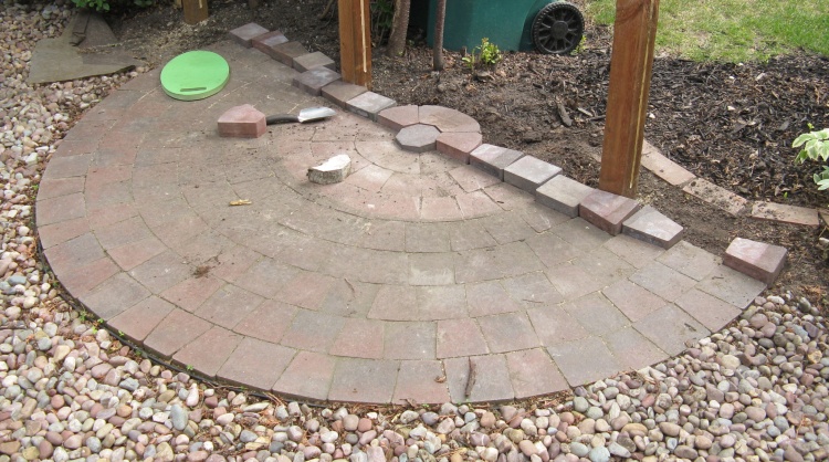 The fence was going to be few inches over from the old one so our paving-stone circle (used as a sweepable area under a bird feeder) needed to be a bit wider if it was to go right up to the fence. Just one additional row of bricks would be enough, and here I've selected some suitable shapes to do the expansion.