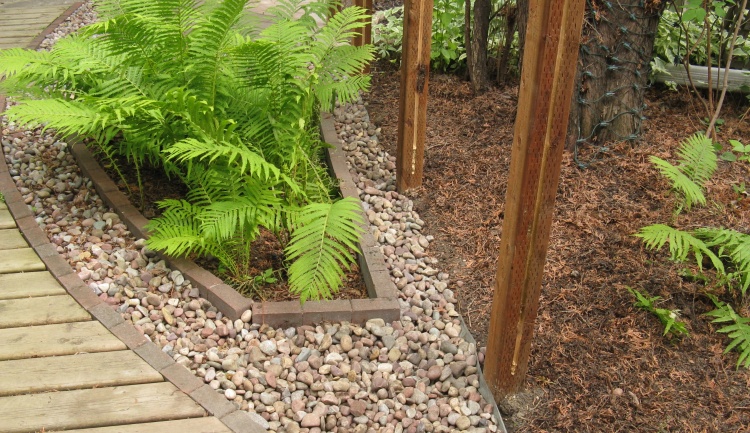 There was also a thin section of gravel behind the block-lined fern bed which needed to get a bit wider, so some digging and landscape cloth fixed that up as well.