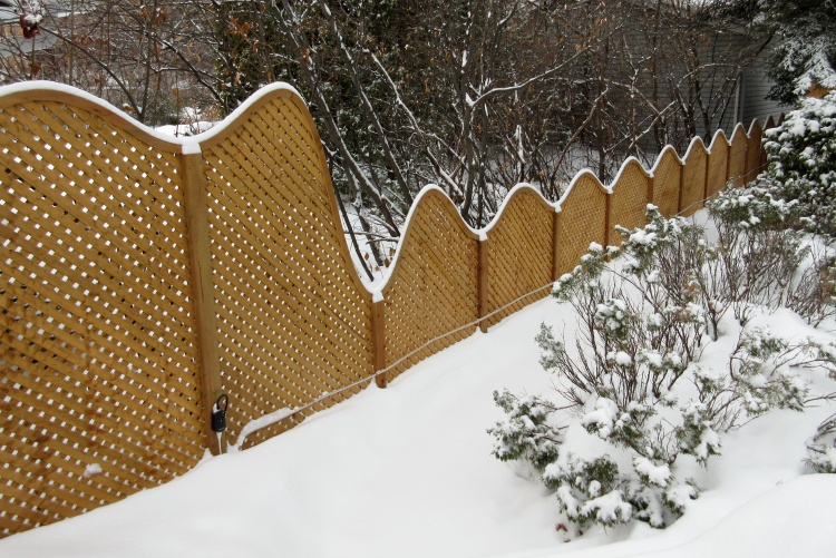 This is a view of the fence after a light snowfall the following winter. I've added some rope lights held on with modified brass cup hooks that we can turn on to light up the path for those late-night runs out to the garbage, recycle or green bins.