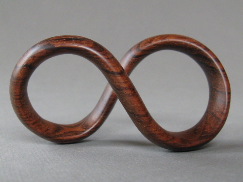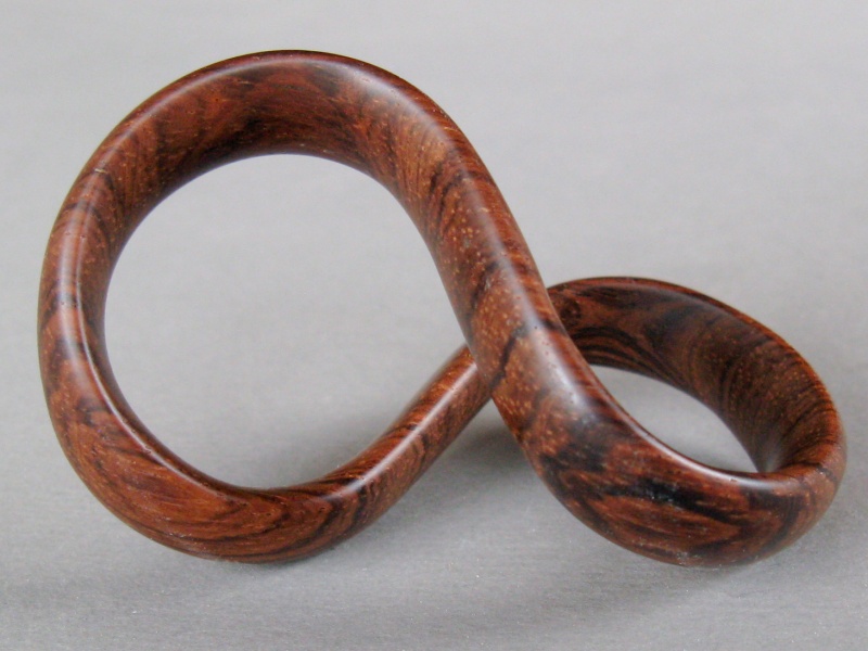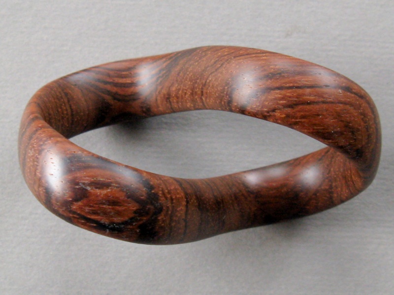 This was just an interesting shape made with some nice wood. I used a small piece of Brazilian Rosewood, sanded it very smooth, and then waxed it. It is nice just to hold and twirl around your fingers. The Rosewood is supposed to smell nice when it is being cut, and in fact it does. But then wood dust in general, and especially from some tropical woods is supposed to be carcinogenic, so one might not want to be drawing deep breaths of the sweet-smelling sawdust for too long. As with many of my small pieces, it was very sanding-intensive. I had found that if an even profile is desired - in this case, an elliptical cross-section - then (I, anyway) need to sand it down by hand to get it there. This piece took about 8 hours to complete. Using a Dremel with an abrasive tool is much faster, but it generally takes too much off too fast and I inevitably carve dips into the piece due to the round profile of the tool. The choice generally came down to having a nice completed piece after a rather long time, or throwing it away much sooner when it was ruined with the Dremel. Hence the hand-sanding.
