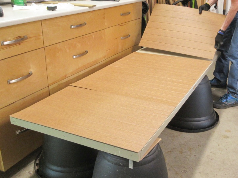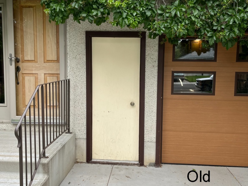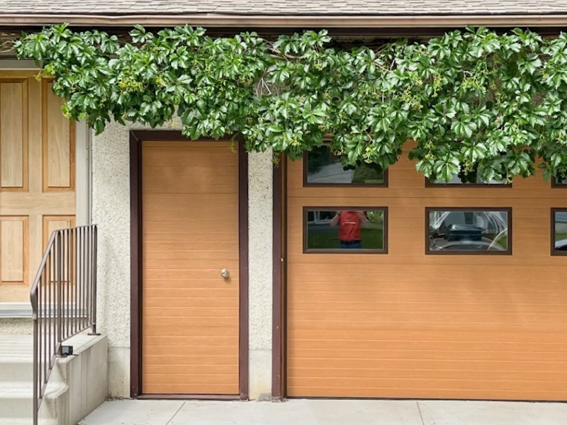 There was no option for ordering a matching-finish residential door from the garage door people so I had to DIY. Or is it DIM in the first person? At any rate that involved ordering an extra overhead door panel, cutting it up and