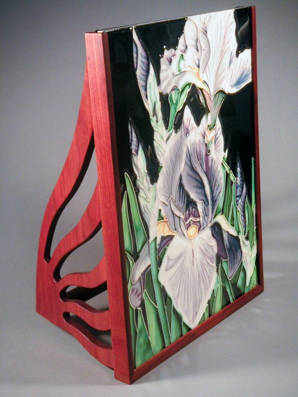 My Aunt received a stained-glass piece that she liked, but she didn't have any place to display it. I figured it needed a stand. She has lots of wood in her living room where this was to go, so I made a wooden holder that could sit on her mantle. I chose the Honey Wood since it had a nice light brown colour - I prefer to use wood in it's natural colour rather than staining it. Having said that, I used a black dye on the back of the holder, but it's just plywood, so it hardly counts as wood. I ended up with a stylized sunburst pattern for the "legs" of the holder to sort of compliment the flower motif of the stained glass. And yes, it sits flat in real life - it was sitting on a curved surface when I photographed it, so one leg in the rear view is not touching the surface.