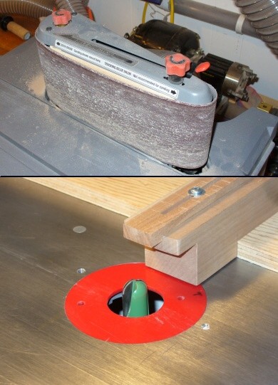 Fortunately, the sander also has a horizontal belt attachment, so I ended up making a curved insert to go under the belt to make a large-radius sander. The insert was just a thin curved piece of MDF with a metal sheath on the belt side to reduce friction and abrasion. It can be seen in the photo below as the cream-coloured insert just under the white label on the sander. It was made with a radius a bit smaller than what I needed for the molding, so this let me produce a nice smooth curve Once the inside curve of the molding was sanded to shape, it was used as a reference for the routing.