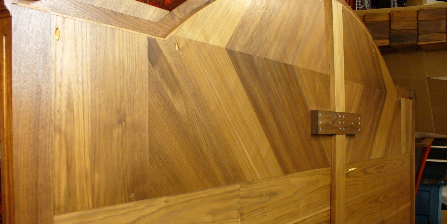To prevent warping of the core material when veneering, it is important to have the same forces exerted on both the front and the back of the wood (so they say). The forces are due to expansion and contraction of the veneer, so you want the same type, thickness and grain direction of veneer on both sides. Consequently the back of the headboard has a similar veneer pattern to the front, except I didn't bother to make the decorative end sections, and I made my own flat veneer on the bottom portion rather than using purchased veneer. I guess time will tell if that was adequate.
