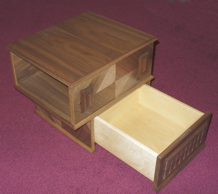 The original driving force for making the headboard was to get bedside tables out of the deal, so they were integrated into the headboard. I used an arrangement of an open-ended enclosed shelf with a drawer below. The drawer was made narrower to provide a bit more clearance to the bed. The cabinets are made from 1/2" veneered Baltic Birch plywood and have rabbit, dado and mitered joints as appropriate. They have diamond-matched veneers on the sides, a book-matched veneer on the tops, and plain flat veneer on all other surfaces. Like the headboard, they are veneered on both sides, but using just plain veneer on the backside, since the small panel sizes seemed to make warpage less of a risk. The cabinets were first assembled dry using screws in order to ensure that everything fit before gluing all the pieces together. In fact, with seven pieces and around ten joints each, I couldn't see any way of gluing the cabinet all together at once, short of a well-trained F1-type pit crew for woodworking. To avoid that, I glued it together in stages, which provided enough time in each stage to ensure things were in the right position, were tightly clamped, aligned, square, etc.