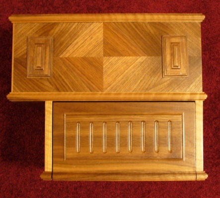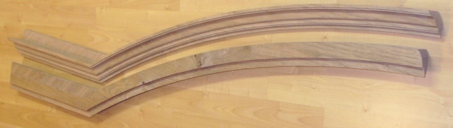Overall the two moldings took about 28 hours, with another half-dozen hours for testing and jig construction. The moldings also needed separate little walls at the straight ends (just 'cause the armoire had them). They were made separately of veneered wood, and glued into place.