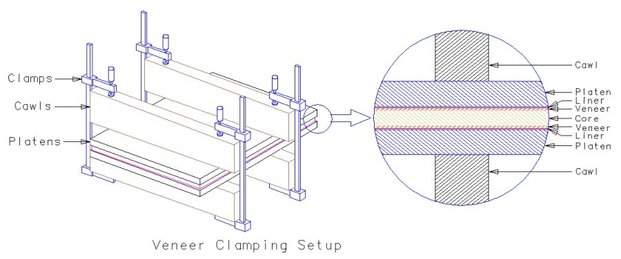 All the veneer was attached with standard wood glue. This needs lots of pressure while gluing, especially with thin veneer. When doing small panels (maybe 12" square), I used a half-dozen clamps, which was about right. I wasn't able to provide that much pressure on the larger portions of the headboard proper, and I have bubbles in the veneer to prove it (in non-critical areas, fortunately). The ideal setup would probably have been a large vacuum press, which I was seriously considering, since it can be little more than a large plastic bag and a vacuum pump. However, after describing this to a woodworking buddy of mine, he whacked me over the head (figuratively, this time) and said "cauls". Or maybe it was "cawls". Anyway, a board that spans the piece and applies pressure via clamps placed at the ends. The pressure is applied to platens, which distribute the force of the cawls. To prevent further cranial/psychological trauma, I decided to use this technique. I curved the cawls slightly on the bottom to ensure that the force is distributed more evenly. I also used a liner of paper towel to absorb any glue that made it through the veneer. That was mostly an issue for the commercial veneer since it was only 0.02 to 0.03" thick. For cases where there was significant thickness variation in the glued-together veneer (i.e the home-made stuff), I used a thin piece of foam (as would be used under a laminate floor) for the liner.