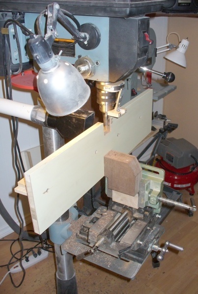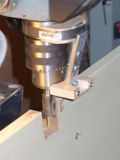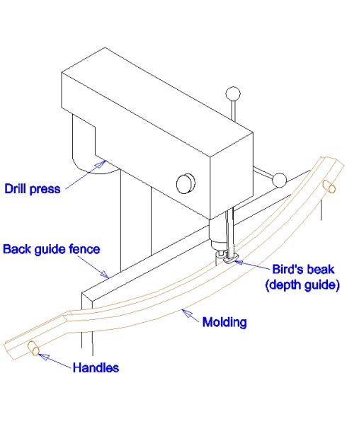 It wasn't possible to use a standard fence for routing since the piece was curved., so I made adjustable "birds-beak" attachments for both the the router table and the drill press to control the offset of the cut. The inside of the molding would bear against the "beak" allowing the cutters to shape the molding at a consistent distance from the inside of the piece.