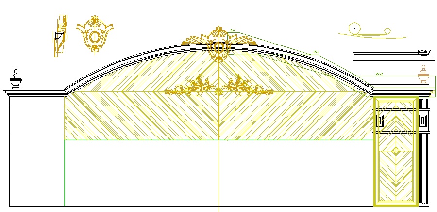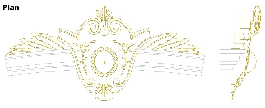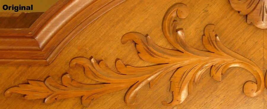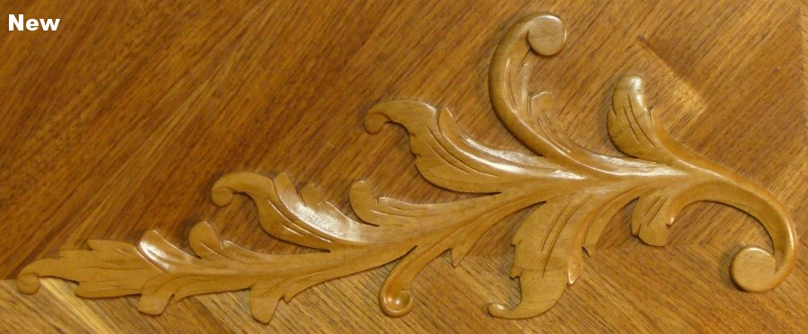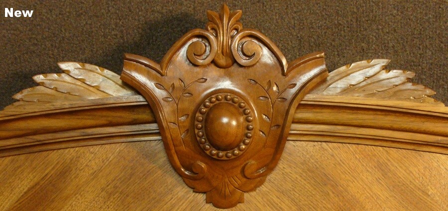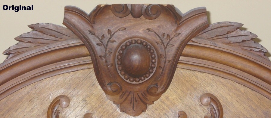 Most of the feature was carved from a single piece, but after blowing the carving of the central dome, I cheated and made it as a separate piece. I was vindicated when I later noticed that the original was a separate piece too. Ah-ha. Unfortunately, pretty much the same thing happened for the little beads surrounding it, and I ended up making those separately and gluing them on as well. Despite an intensive examination of the original, there was no vindication for those. The feature took about 40 hours to carve and sand. The leaf stacks on the sides were carved as separate pieces.