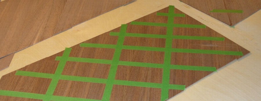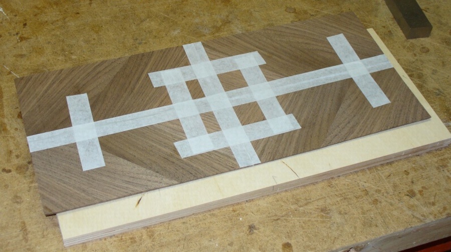 All the home-made veneer pieces and sub-pieces (original 2" wide sections) had the joined edges squared and straightened with the jointer and/or a straight sanding block. This minimized the visibility of the joints. Masking tape or veneer tape was used to assemble the 2" strips into veneer sheets. The veneer tape is a paper tape with an adhesive that you moisten to activate. As the tape dries on the wood, it contracts slightly, drawing the pieces closer (or tighter) together. Masking tape seemed to work almost as well, so I used that on a number of the pieces, since it has the advantage of not needing to dry. The first photo below is a diamond-matched veneer piece for one of the surfaces of the cabinets, with four separate pieces held together with veneer tape. The lower shot is one quadrant of the main headboard diamond-matched veneer being assembled from 6" and 8" sections of veneer, and held together with masking tape.