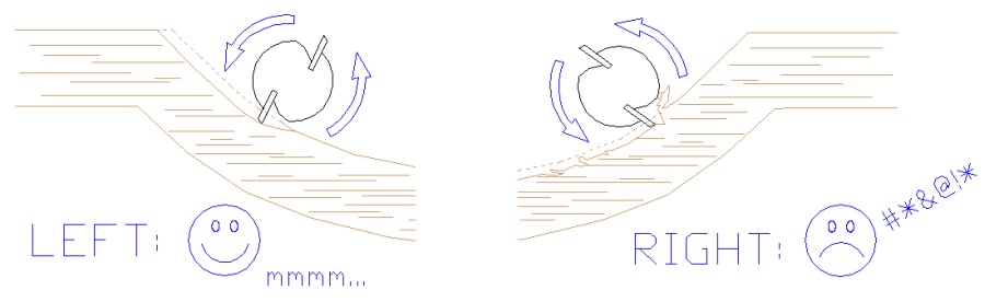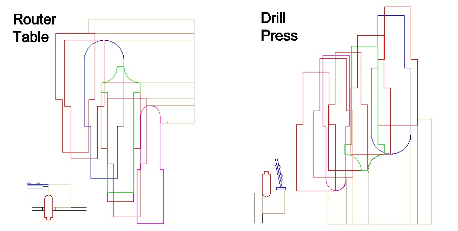 I finally ended up making a jig for my drill press so that I could use it like an upside-down router, so this made the cuts from the curved side of the molding rather than the flat side, to prevent cutting directly into the grain. This couldn't be done with the router table since I needed to make the cuts from the concave side of the molding, meaning there must be room for the work piece to extend past the plane of the cutting bit. The drawing below shows the router bit shapes used on each part of the molding for the two setups, with the little sketches showing the general routing geometry.