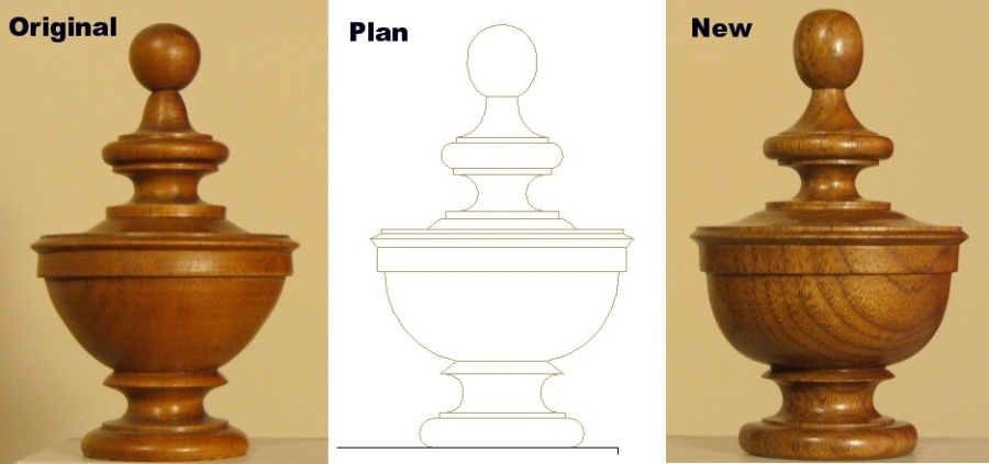 The corners of the headboard have decorative spindles, or more precisely, semi-spindles. They match the ones found on the front corners of the armoire, but given the limited thickness of the headboard, the side against the wall is flat. That is good, since it meant I could make just one spindle and cut it in half rather than trying to make two exactly the same. The spindle was just turned on the lathe with the aid of a cardboard outline to help get it similar to the originals. In retrospect, I can't say they are identical twins. Maybe the new one is an older brother. With a different father. But I actually like the curve of mine better anyway - the old one kind of has a "weak chin" look to it. Besides, they will be 6 or 8 feet apart, so the differences shouldn't be too obvious. And let the record show that the two on the armoire are not identical either. It took about 7 hours to turn it, sand, and cut them apart. Like the originals, they are just mounted to the headboard with unglued dowels so they can be pulled off for moving.
