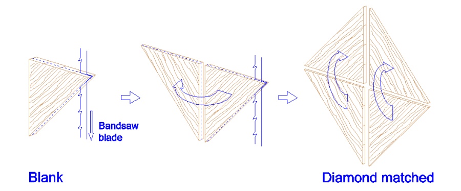 To make the matched veneer, I needed to start with a piece that could be cut into four layers and unfolded to have the grain line up. I cut my planks into 1/2" thick pieces, and assembled them into suitably-sized 1/2" thick boards, usually no more than 6 or 8" wide. I then cut the board in half to make two boards 1/4" thick, and then cut each of those in half again so I ended up with four boards 1/8" thick. This stack of four thin boards was unfolded in the proper arrangement to match the grain patterns. In practice, due to saw-kerf thickness, the final "boards" (i.e. veneer pieces) were around 0.05" to 0.08" thick.
