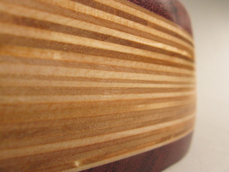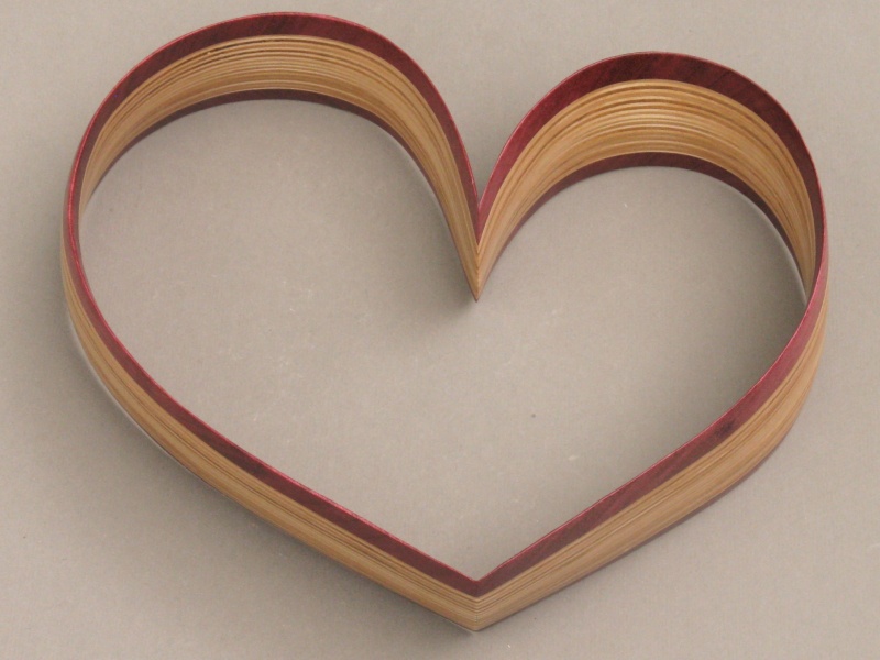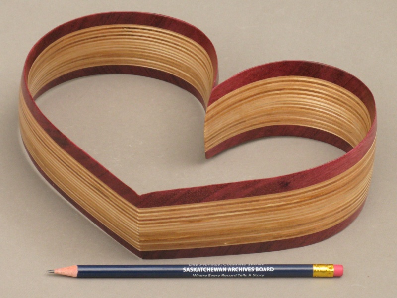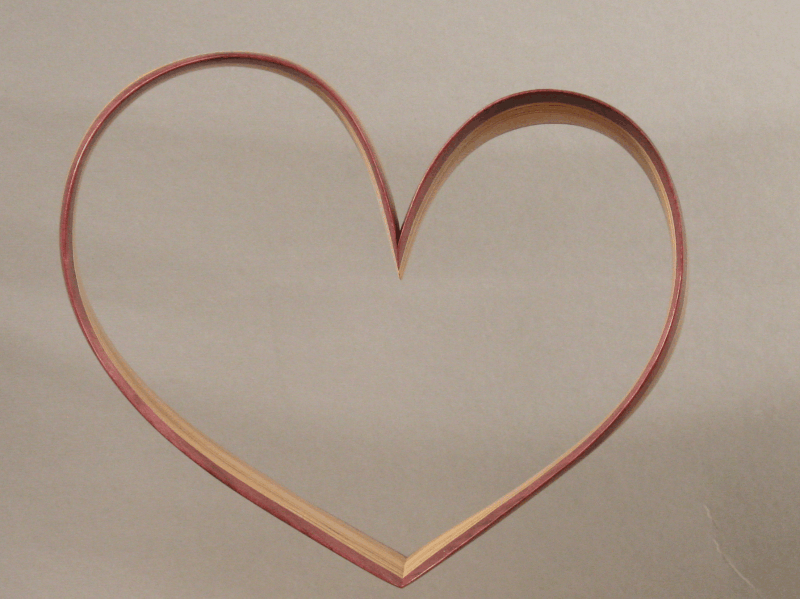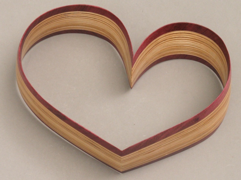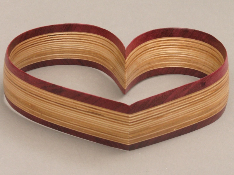 The heart's ribbon-like structure is made from birch and purpleheart. More specifically, two layers of birch plywood are sandwiched between pieces of solid purpleheart. The