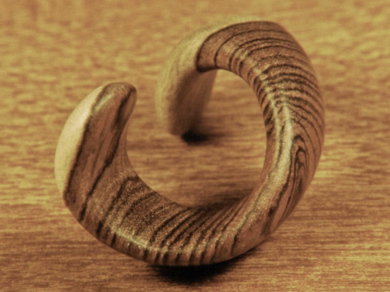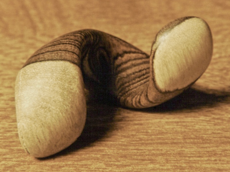 This is a little piece I made for a friend of mine who enjoys eclectic things. It is carved in a helical shape with an overall round cross-section (and of course, it rolls...). It is made from Kingwood, including some contrasting sapwood.