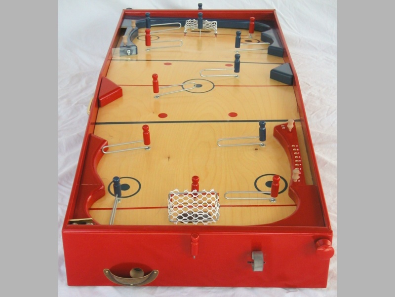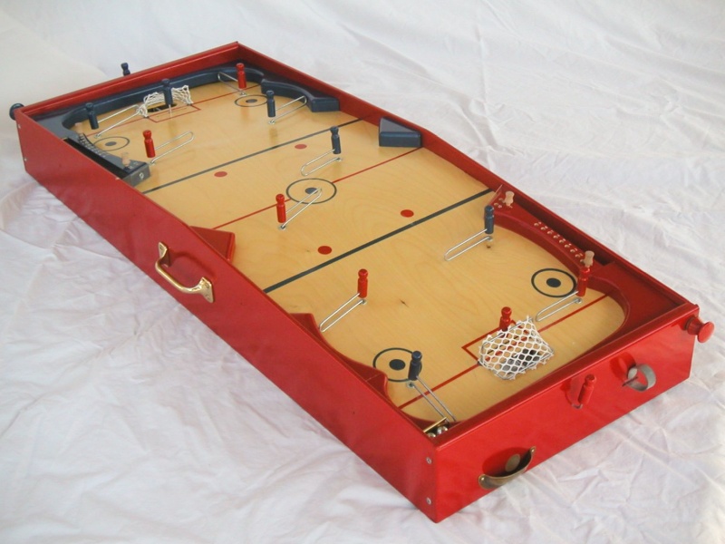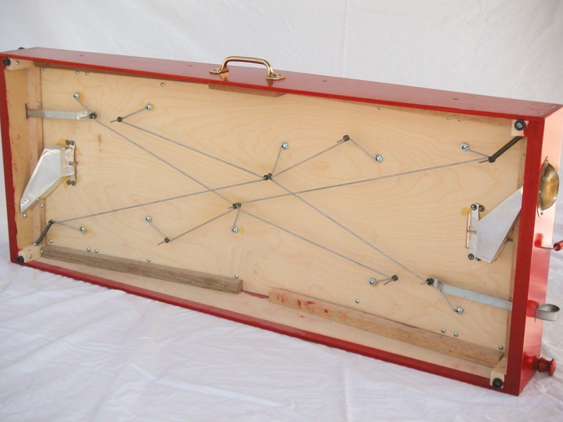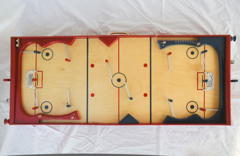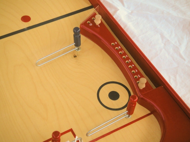 This is a reproduction of an old-style table-top hockey game reportedly produced in Canada from the 1930s through the 50s. A hardware kit consisting of the metalwork and the "players" was purchased from Lee Valley Tools (where a disturbing percentage of my income has gone over the years). The construction was fairly straightforward, with much of the 20 or so hours of effort being spent in assembly and finishing. As can be seen from the bottom view, the large, spring-loaded loop is attached to all the players except the goalie. Pulling it causes all the players to swing their "sticks" in synchronization towards the opponents goal. Instead of a puck, the game is played with a ball bearing. The playing surface is sloped so there are no dead spots - the ball will always roll to be within reach of some player's stick. With a bit of practice, you can pass and shoot. This is actually easier to do than on a modern table-top game since coordination of two hands is not required - handy for coordination-challenged people like myself. I've also managed to lose to kids with who used no strategy at all except to keep pulling the loop as fast as possible so all the players kept swinging. But I'm sure I could have won if I'd really tried...