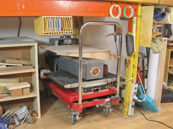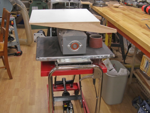 The table needed to be fairly sizeable but the trick was to make something that didn't use up a bunch of storage room in the shop. I considered various permutations including having it fold up (not really any room on the side for that) and storage on the front of the cart (pretty inconvenient). I settled on having it stashed flat on top of the sander in what would otherwise be unused space.