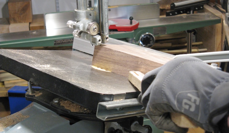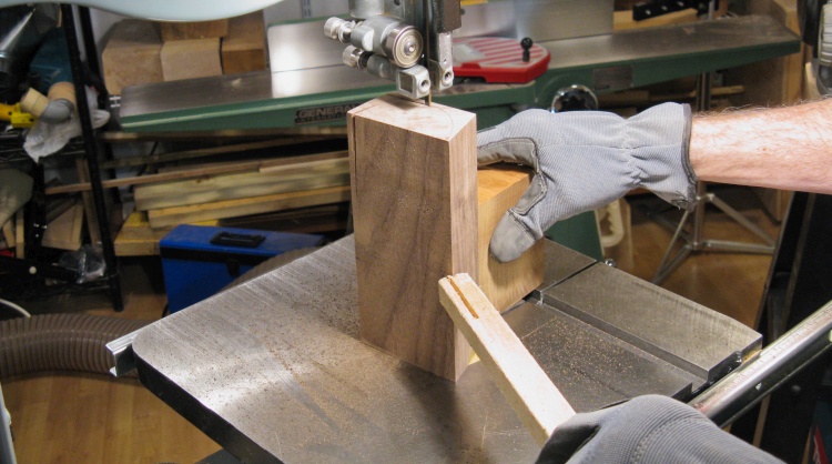 After taping on a square piece of wood to keep the bin vertical and to provide a handle, I marked the curve on the end and cut it on the bandsaw.