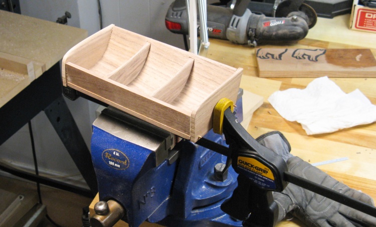 The dados were a bit narrower than the walls, so the walls were tapered a bit at the bottom edge to fit snugly and were glued into place (along with a dadoed back wall which isn't in this photo).