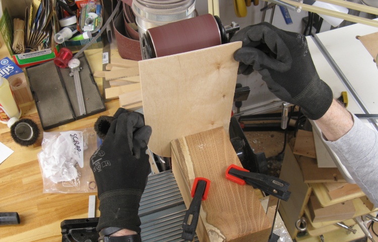 At any rate this is a shot of the front edge of one of the walls being tapered by sanding on the belt sander (with the aid of a nice block of Black Locust that I'll have to turn into something less square some day).