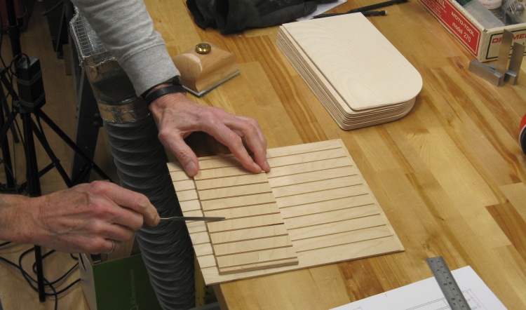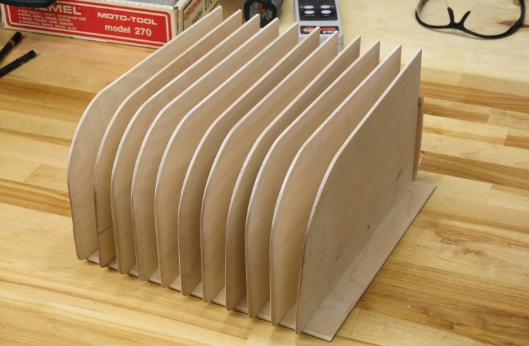 When coming up with the design I considered some more wood-efficient versions but they were all effort-inefficient so I stuck with the simple design of solid 1/8" plywood walls in a slotted floor and back as the rather crude drawing below illustrates.