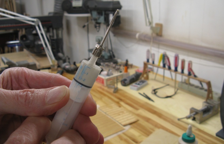 The syringe in this cobbled-together arrangement might have come from Canadian Tire but I think Lee valley has glue syringes with tips that don't need to be masking-taped in place. Gotta add those to my list...
