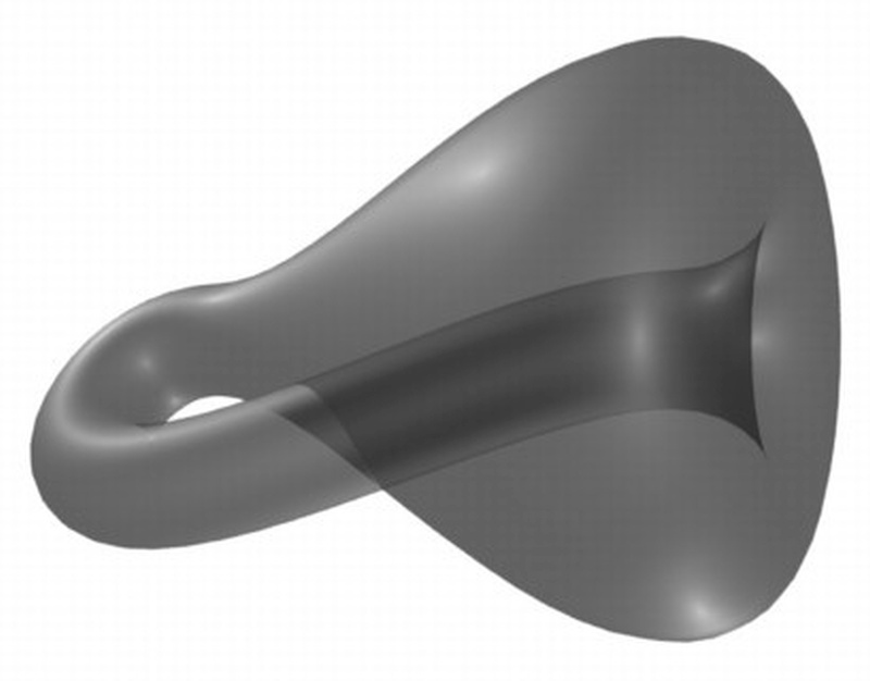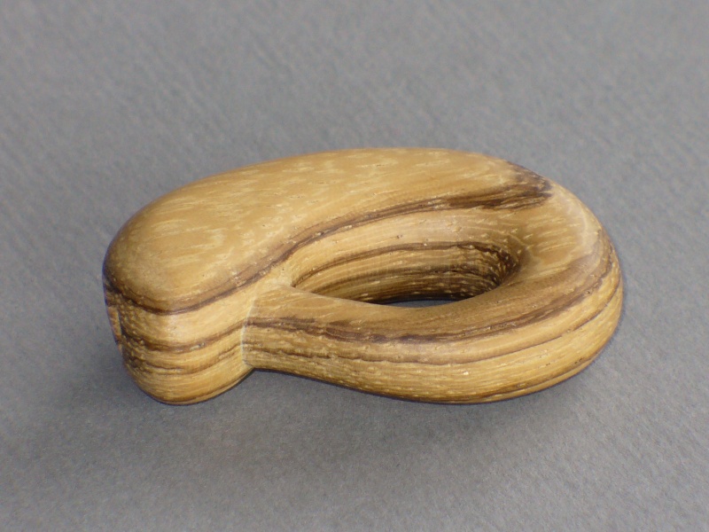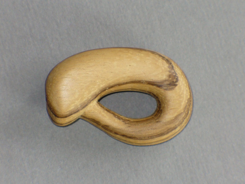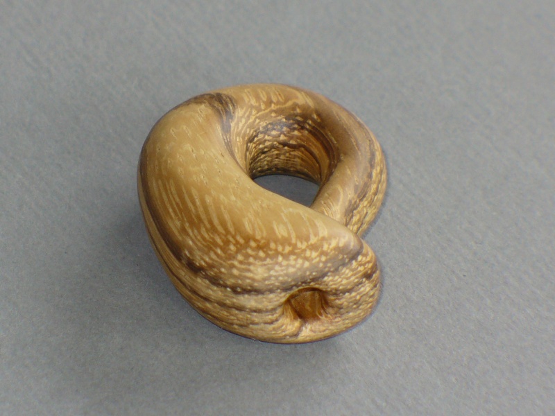 This rather pathetic little piece is a representation of a Klein bottle. The Klein bottle was suggested by a buddy of mine as an interesting carving exercise. The concept is that it is a one-sided bottle that sort of intersects itself, a bit like a mobius strip in three dimensions. Unfortunately, it is not very impressive unless you can see through the bottle to appreciate the shape. The carving was only the outside of the bottle, of course. Theoretically, you could carve a real one from a single piece of wood with some very sophisticated, articulated carving tools, but then you'd have to X-ray it to prove it was right inside. Or carve it really, really thin, and shine a light through it. I'll leave that as an exercise for the reader. I used Zebra Wood for this little bottle. It has a striking grain, which is a bit too obvious for my taste. Adding to the experience of carving Zebra Wood is that it really stinks when cut - sort of the opposite of Rosewood.