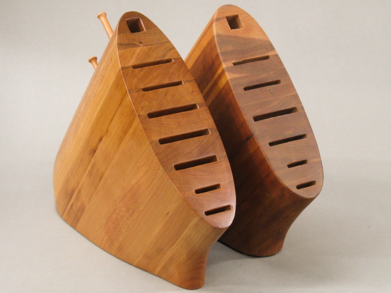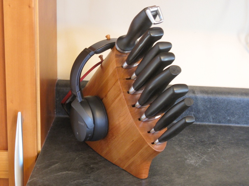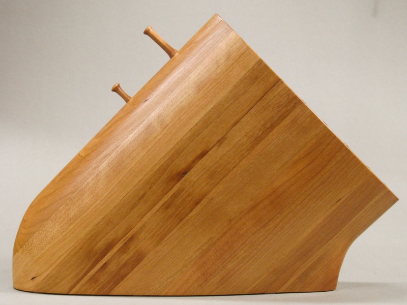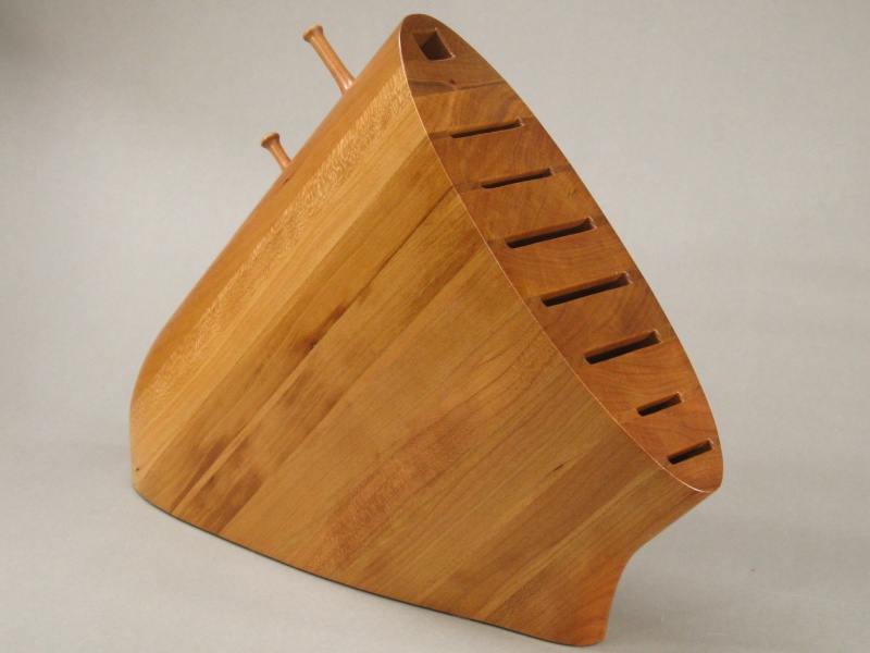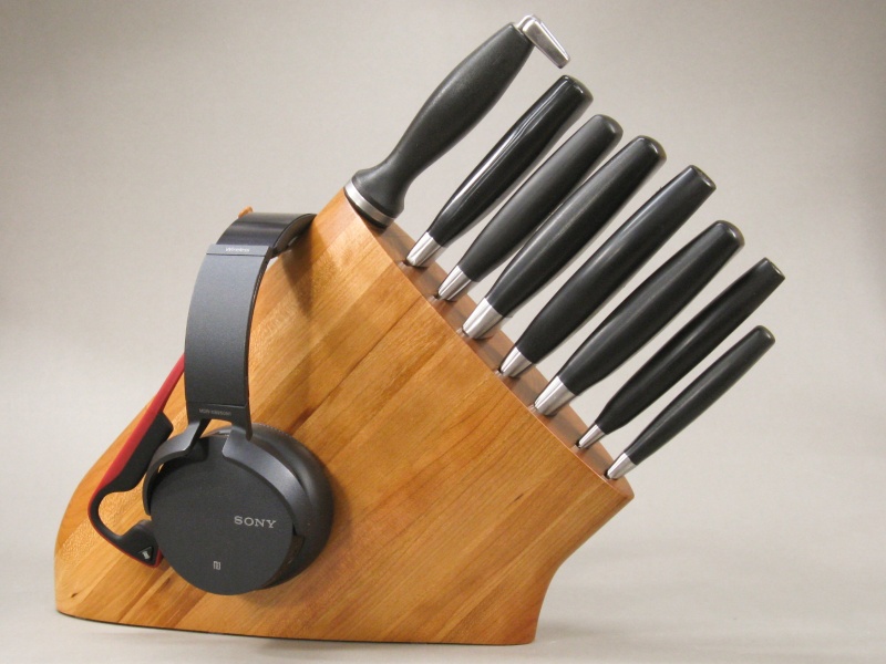 same laminated construction of cherry but around an inch longer than the 1997 original. The current knife block was also being used as a makeshift holder for a couple pairs of wireless headphones, so I included some pegs in the new design to accommodate those.