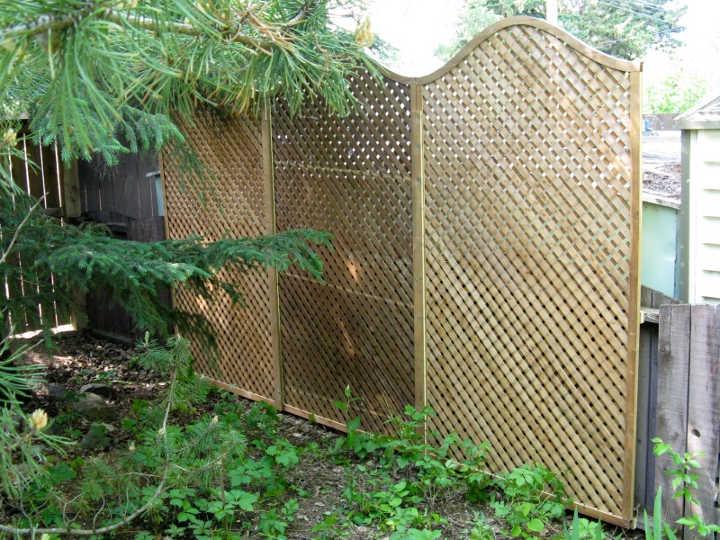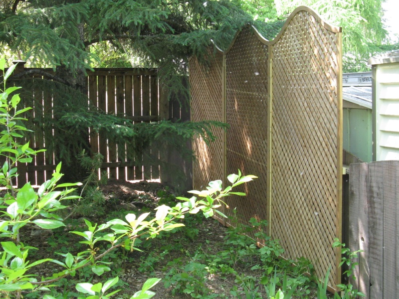 I selected a commercially-made "privacy" lattice which is mostly wood with only small holes. It's made from the brown variety of treated wood and I made frames for the three-panel section out of brown treated wood as well. The tops are contoured to make it a bit more attractive and the three panels are attached to the fence. The fence itself should actually be replaced but until that fateful day, I hope it will hold up the lattice. Of course there is the distinct possibility that the attachment of the tall lattice will in fact hasten that fateful day, but time will tell. The