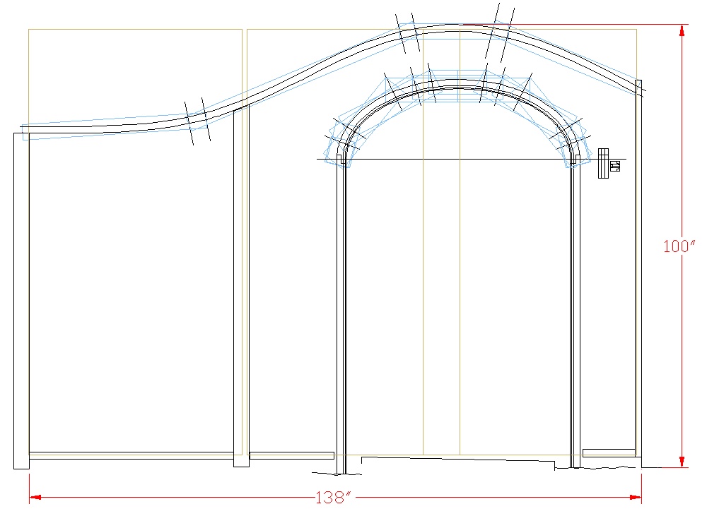 To give the doorway frame (on the right here) a bit of heft, it was made about 2-1/4" square in cross section with a stepped profile on the inside for visual interest. Obviously for a large curved piece like the doorway top I was going to have to use multiple pieces of wood. Since I wanted to avoid doing any fancy wood joinery, I opted to use three multi-piece layers of wood (1x6 fence pickets) laminated together and overlapping. Those are the blue pieces in the plan above.