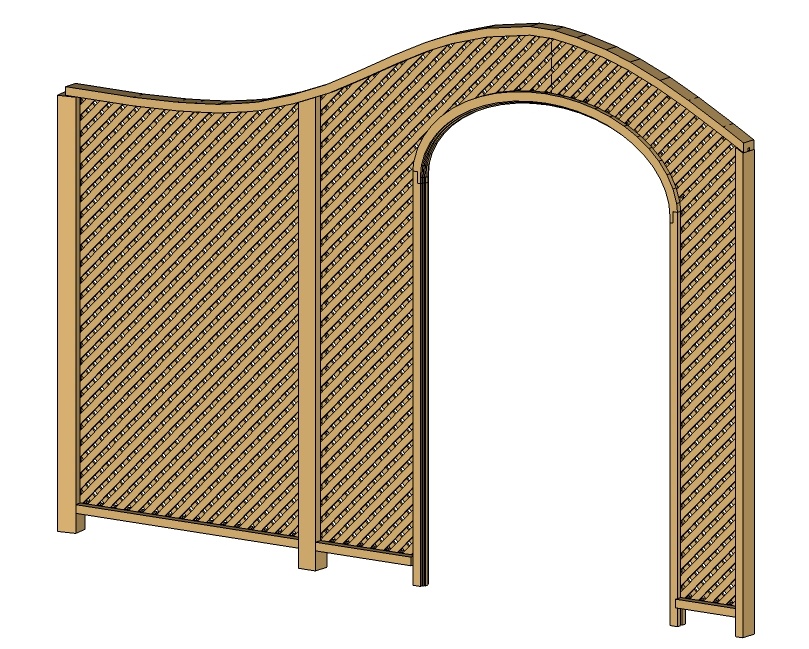 I wanted the top of the lattice to be wider than the 1.5" I'd used for the fence so that it would have a bit more strength. I decided to laminate two cedar 2x4s together and then cut the curve out as this sketch shows. I staggered the joints between the 2x4s to give a good glue joint.