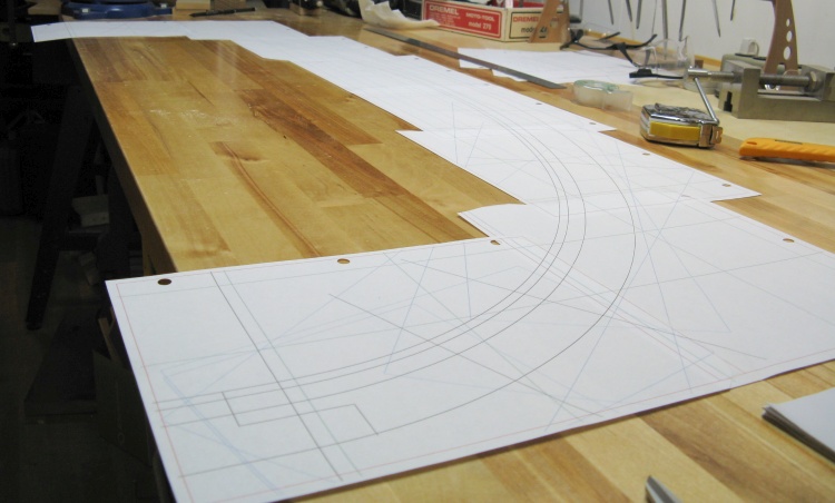 I started with the curved (elliptical, in fact) top by printing out a full-sized plan. The 8-1/2x11 sheets were then held together through the magic of, well, magic tape.
