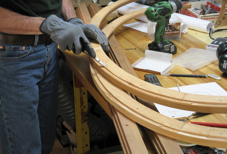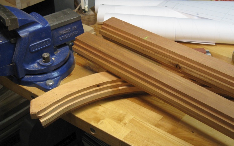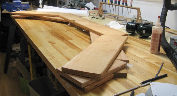 Each layer was composed of either three or five pieces laid out to cover the curve. The simple butt joints between the pieces were offset from layer to layer so there was always two layers of solid wood beside a joint.