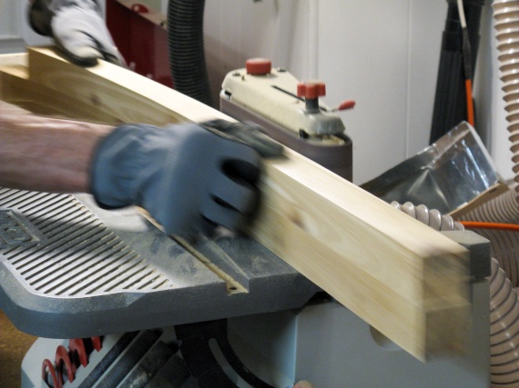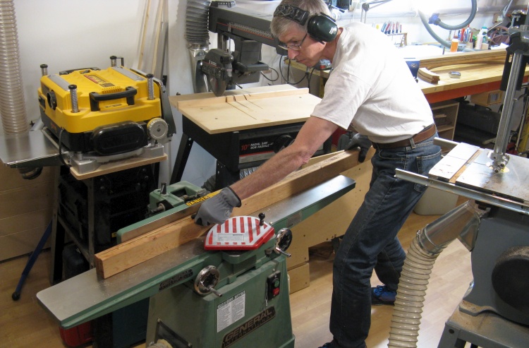 To get nice straight sides the best way is to use the jointer. Unfortunately my workshop wasn't wide enough to put a 6' piece through the jointer so to get enough room I rearranged things to let the jointer to run the long way in the shop and here I'm flattening one of the sides.