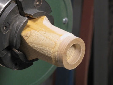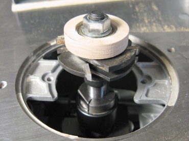I needed to do some shaping on the pieces. Some could be done with the same router bit used for the slot but I also needed a shallower cut made. For that I had to modify the bit by increasing the size of the bearing. The following shots show a small maple ring being turned for this purpose.