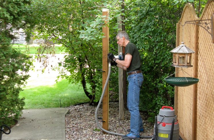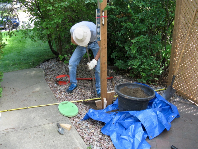 First up was digging a post hole and planting the one post I needed. I used a 9' treated-wood post just like those used for the fence.