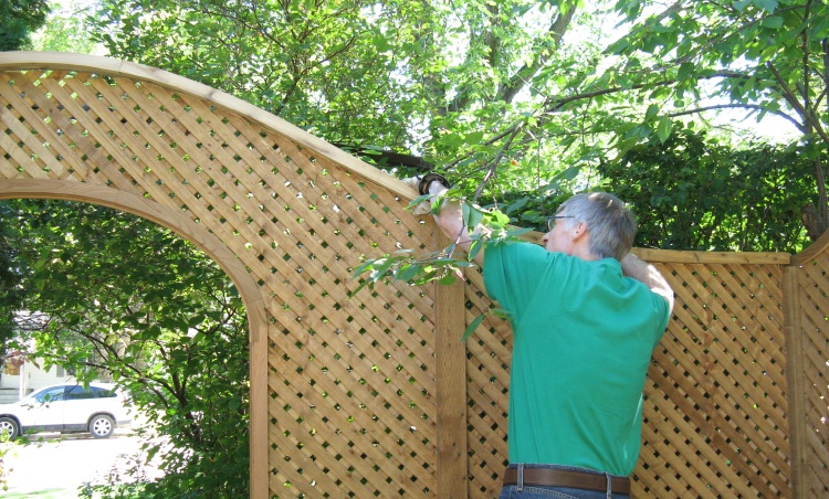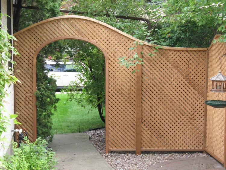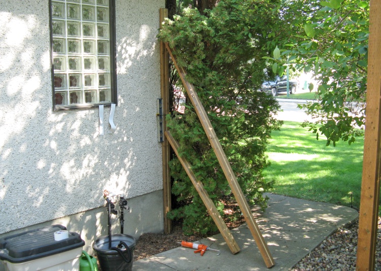 I had seen a picture of a lattice-based side yard divider a number of years ago and liked the look, but it never rose to a high-enough level of necessity to inspire me to create one. However, since we just built a lattice-based fence right next to where it would go, I thought that might be a sign that it's time had come. Putting in the divider also gives us the option of removing or trimming a rather haphazardly-growing dogwood bush that we've left largely unmolested since it's the only thing blocking the view from the street.