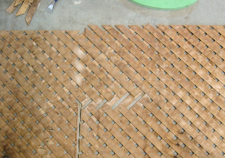 I managed to mess up a bit on the positioning of the lattice so a few slats were a bit short at the highest point. Rather than replace the problem slats, I just glued on some patch pieces as shown here.