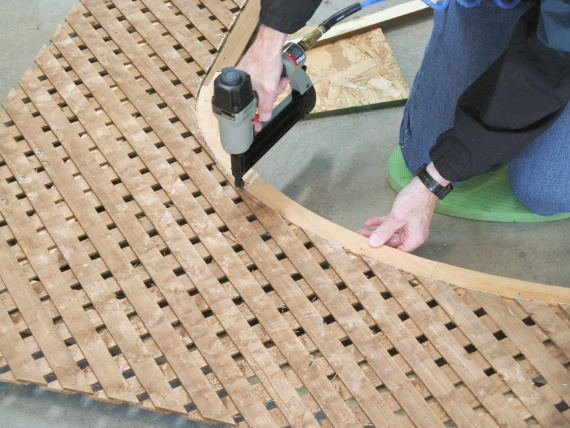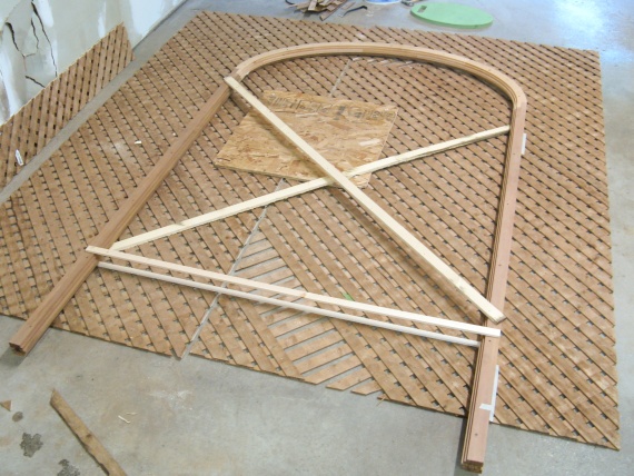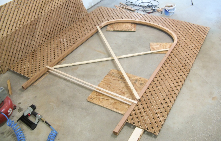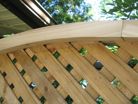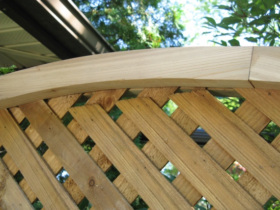 The curve was cut using a jigsaw and then I installed the top by manuevering, coaxing, cajoling and maybe whacking a bit to get the lattice into the slot on the top frame.