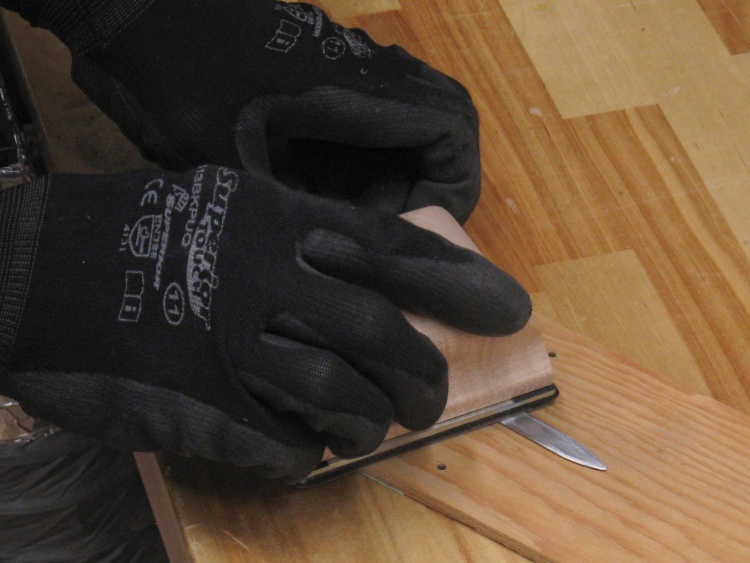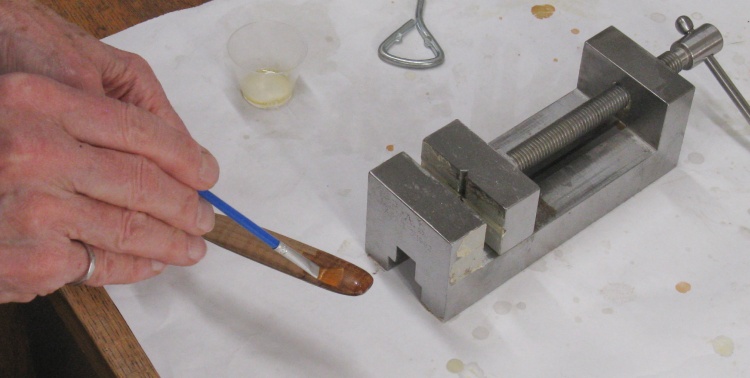 The handle was finished using three coats of Minwax Wipe-On Poly. Here the first coat is going on with a tiny brush.