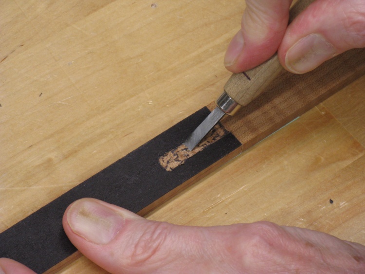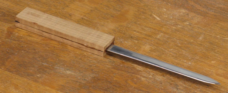The slot was formed by making a groove on each handle side with a bit of small-chisel work, starting with the veneer-equipped side.